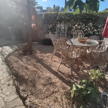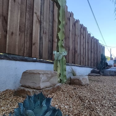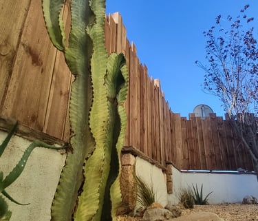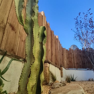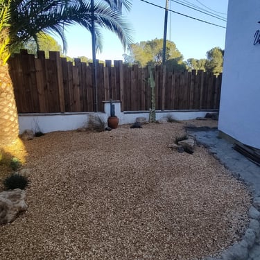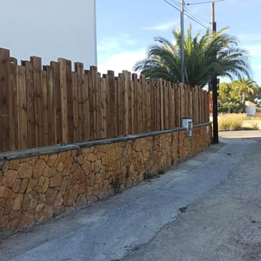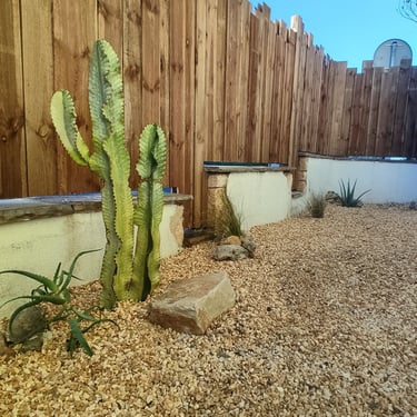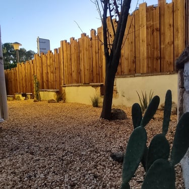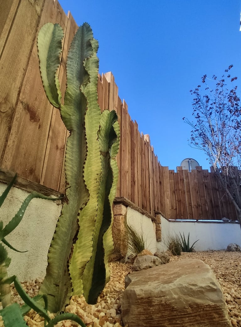 Así pues, siguiendo unas premisas muy claras (bajo mantenimiento, ahorro de agua y estética) , diseñé un jardín de estilo desértico con plantas xerófitas. Se eliminaron gran parte de las especies vegetales de origen, así como toda la valla vegetal perimetral y esta se sustituyó por una valla de paneles irregulares de madera de pino tratado al autoclave. Se ganó, así, mucho espacio útil en el jardín, aportando luminosidad y una coherencia entre todos los elementos del mismo.